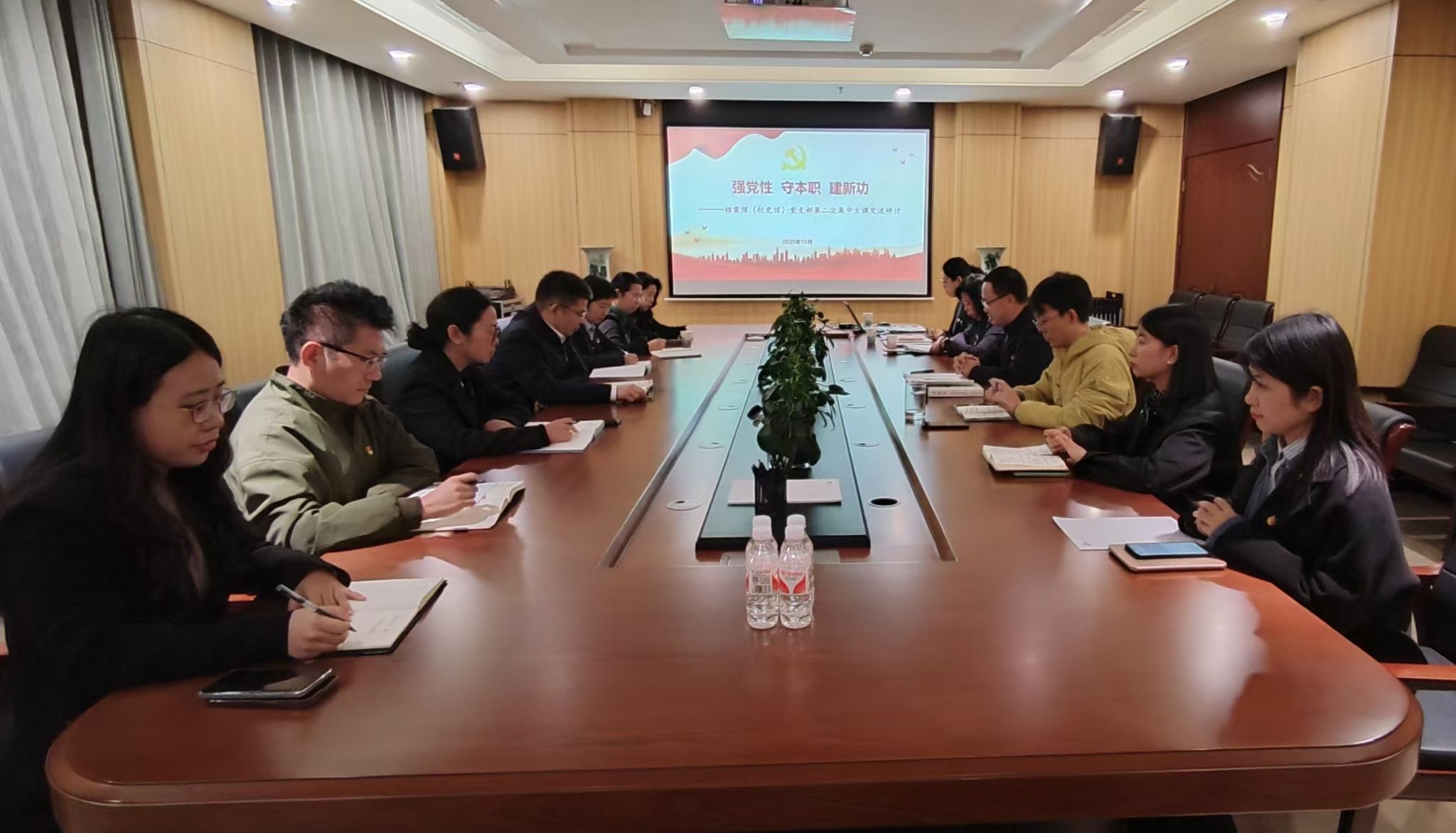 为深入学习贯彻习近平总书记关于加强党性修养的重要论述,切实将理论学习成果转化为推动档案、校史与校友工作高质量发展的实践动能,10月23日下午,档案馆(校史馆)党支部以“强党性 守本职 建新功”为主题,召开第二次集中大课研讨交流会。党支部全体党员参会,王跃华副校长以普通党员的身份参加交流研讨。省委教育工委集中大课指导组到会指导。